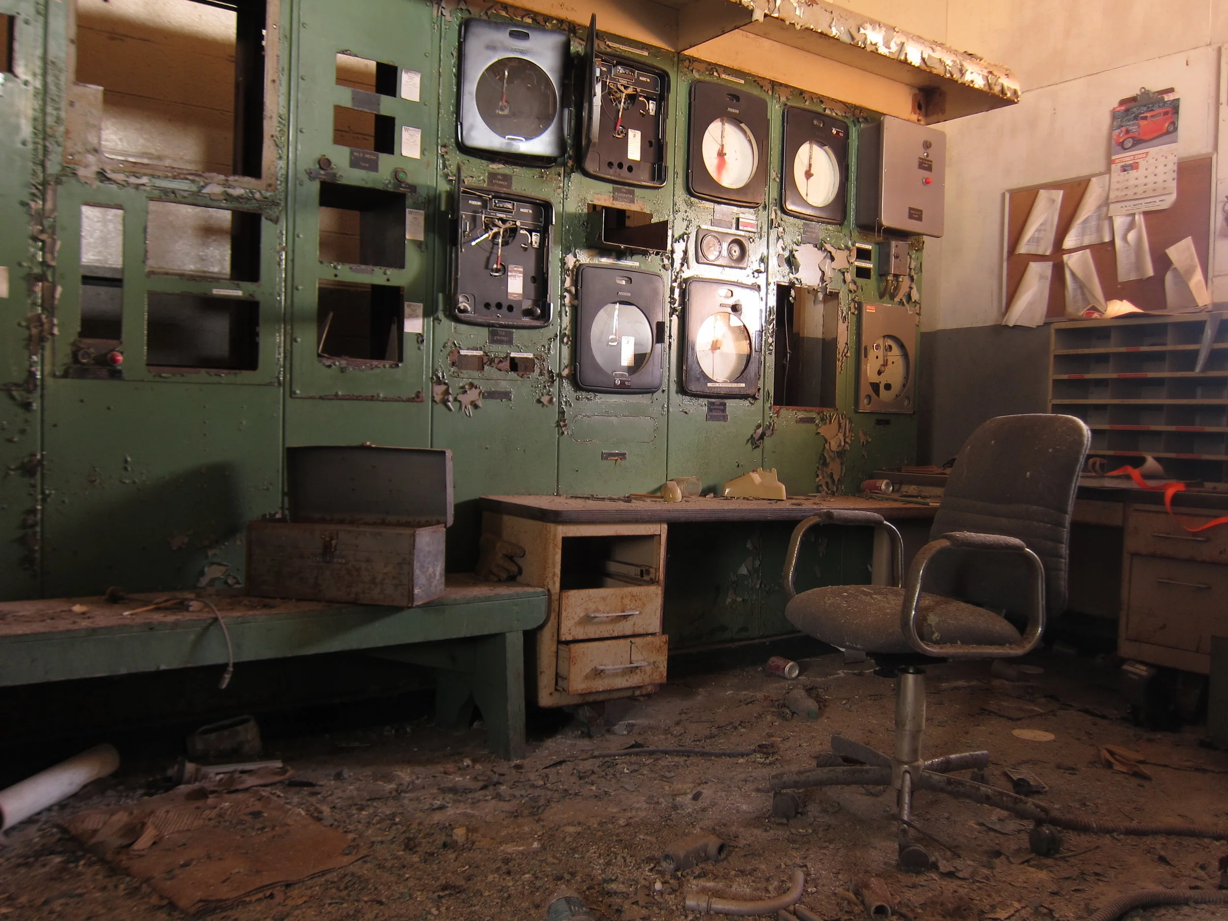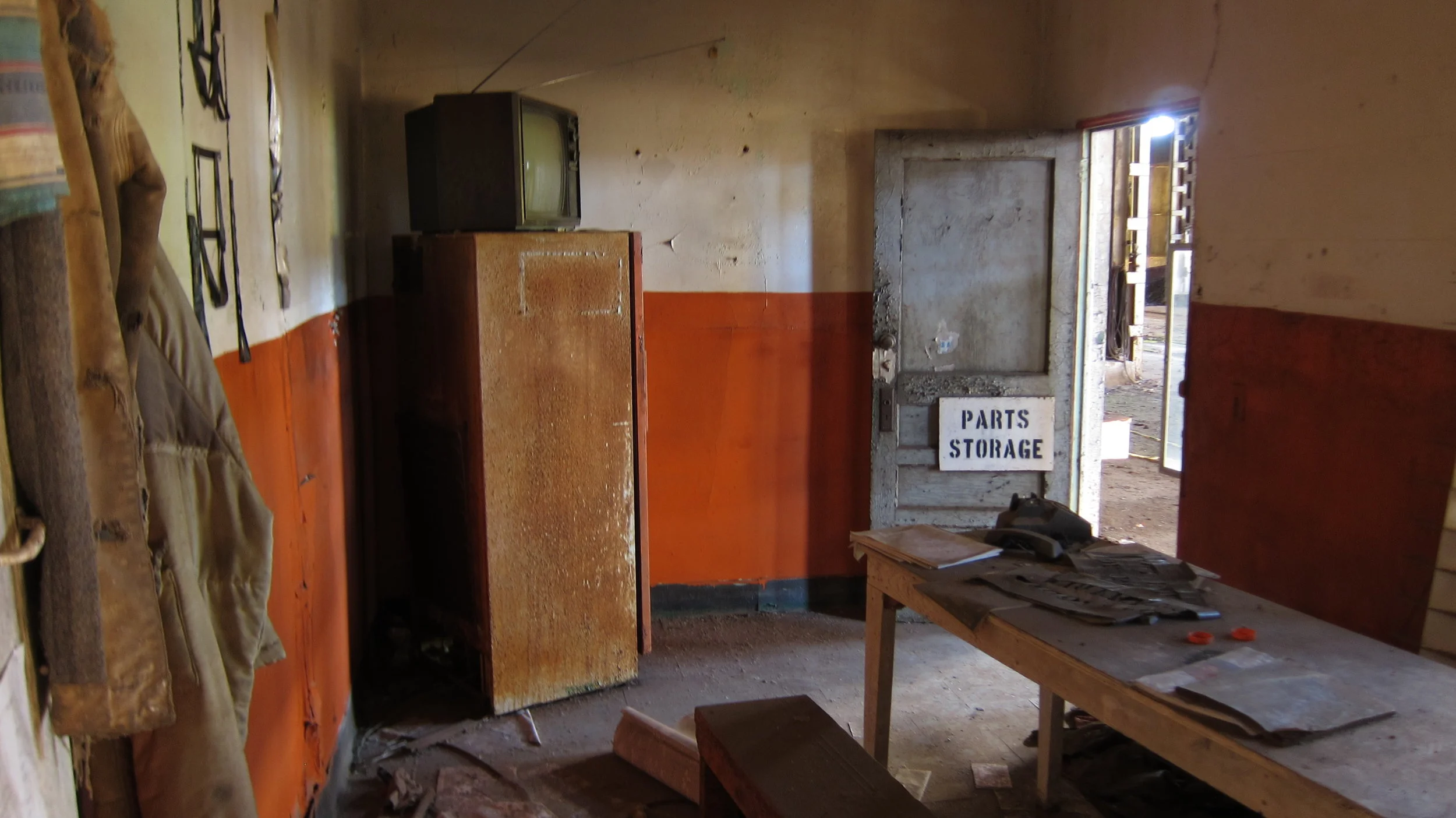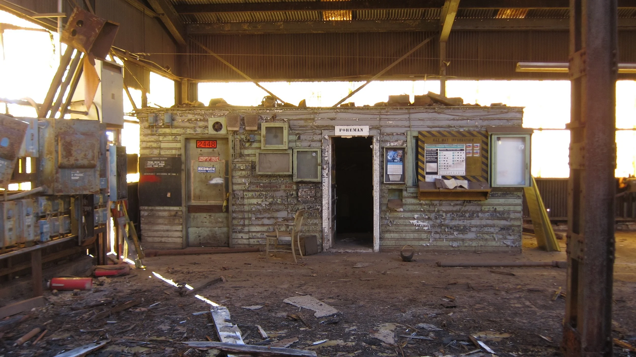 Once inside the shed, I tiptoed around clumps of rotting wood, glass shards and crumbling asphalt shingles from a partial roof collapse. To my immediate left, I noticed an open door to what was most likely the shop foreman's office. Peering inside, the beam of my headlamp illuminated something rarely seen in an abandonment. Aside from a thick crust of red dust and cobwebs, the office looked presumably just as it had when the plant was active. Coats still hanging on their hooks, inboxes still stacked with cracked, yellowed paper and a refrigerator full of leftovers from three decades ago.