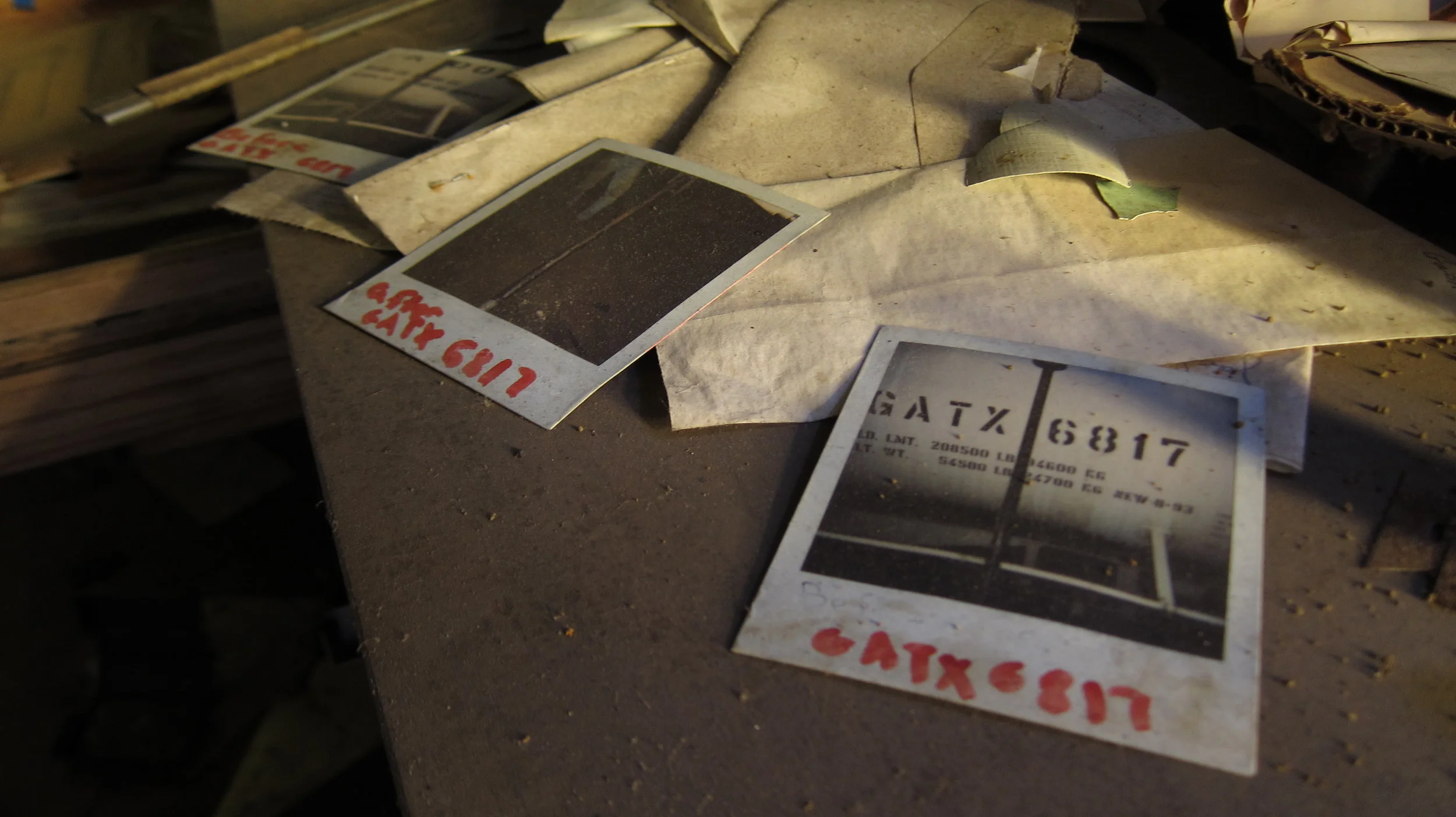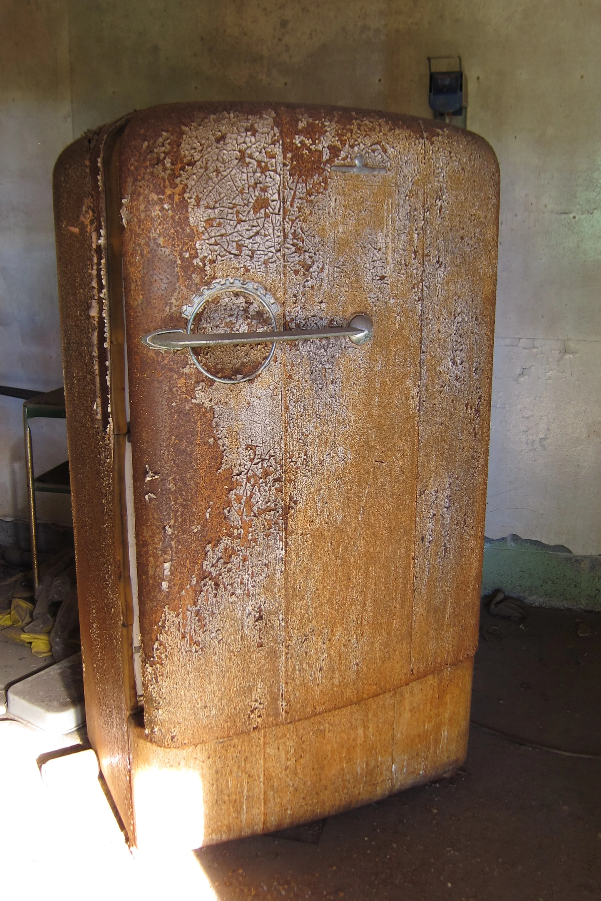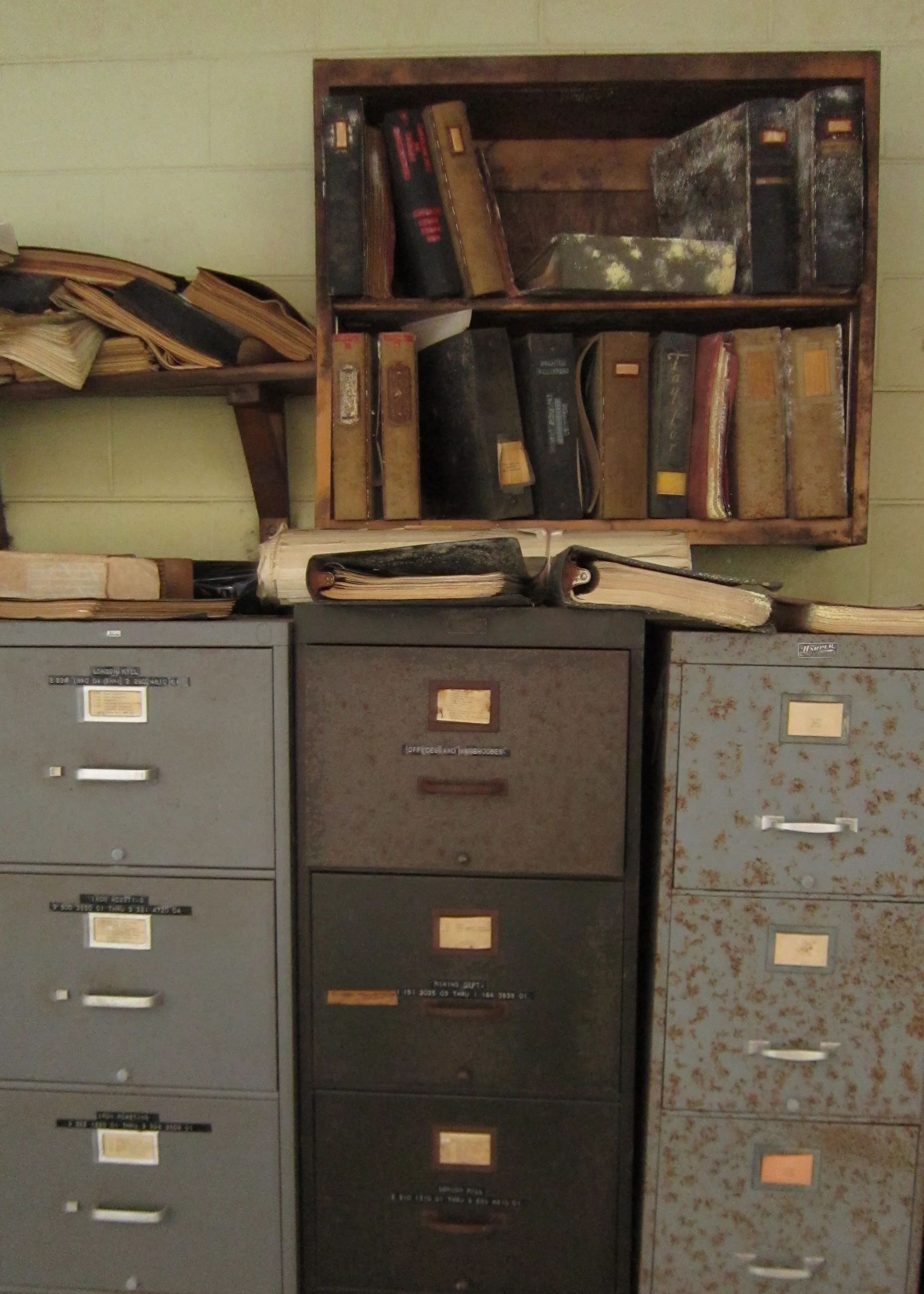 Once inside the shed, I tiptoed around clumps of rotting wood, glass shards and crumbling asphalt shingles from a partial roof collapse. To my immediate left, I noticed an open door to what was most likely the shop foreman's office. Peering inside, the beam of my headlamp illuminated something rarely seen in an abandonment. Aside from a thick crust of red dust and cobwebs, the office looked presumably just as it had when the plant was active. Coats still hanging on their hooks, inboxes still stacked with cracked, yellowed paper and a refrigerator full of leftovers from three decades ago.