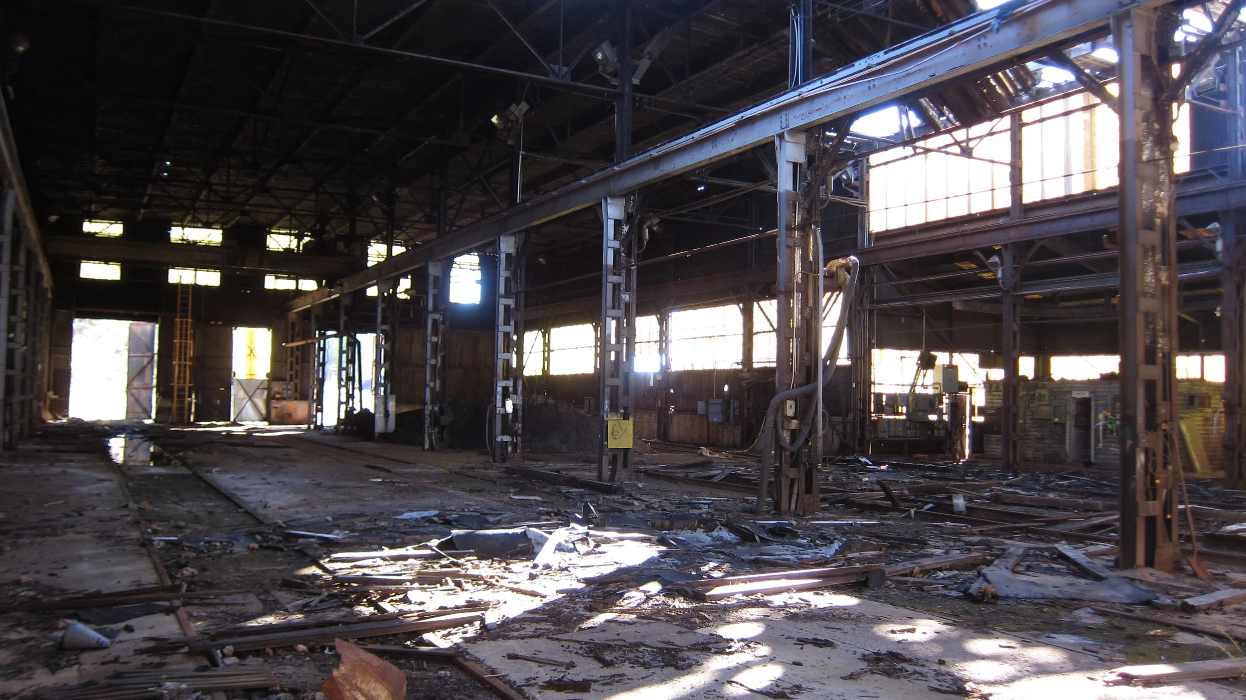 Stepping back out into the sunshine, I followed the remnants of a railroad spur toward the next set of buildings, hopping from one cross tie to the next (workers had long ago ripped up the steel tracks for scrap). These two remaining buildings served as some sort of fabrication facility, though for what product(s) I could only imagine. Massive spools of wire and acid storage vats suggested different uses, though it's possible the buildings had been converted to storage shortly before being abandoned - we run into that a lot. Curiously, a portion of one building had been demolished but the job was never completed - slabs of concrete dangled from the roof on strands of rebar like pilling on a wool sweater.