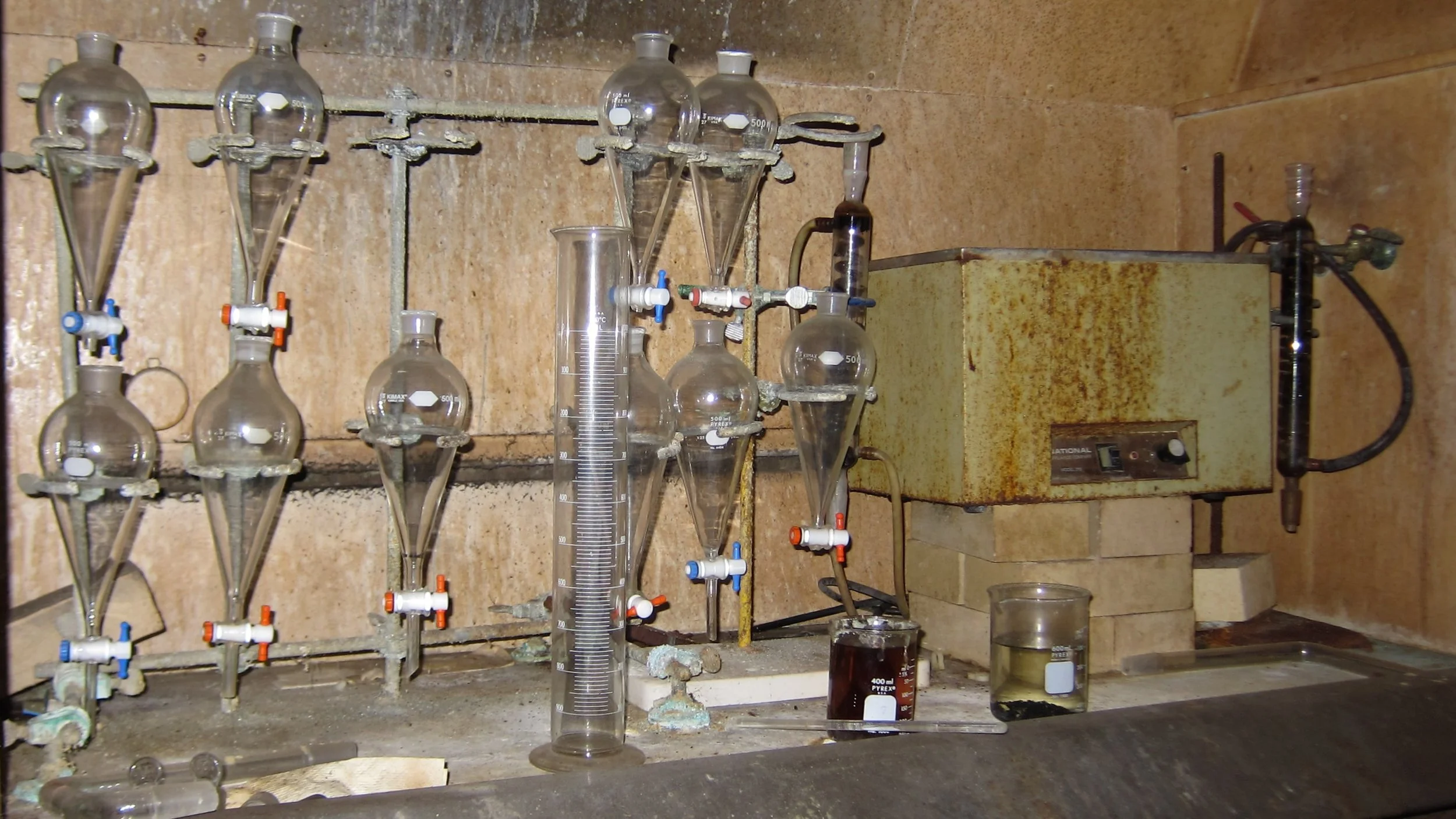 There before me sat row after row of pristine glassware - flasks, beakers, pipettes, burettes, you name it. To see that much unbroken glass in an abandoned building is rare enough but many of these containers still had chemicals in them; it was as as if the chemists went on break and just never came back. Sulfuric acid solutions and who knows what else filled the drawers and cabinets. From flask stands covered in at least two decades of rust hung various pieces of glassware, each appearing clean enough to have just come out of the box.