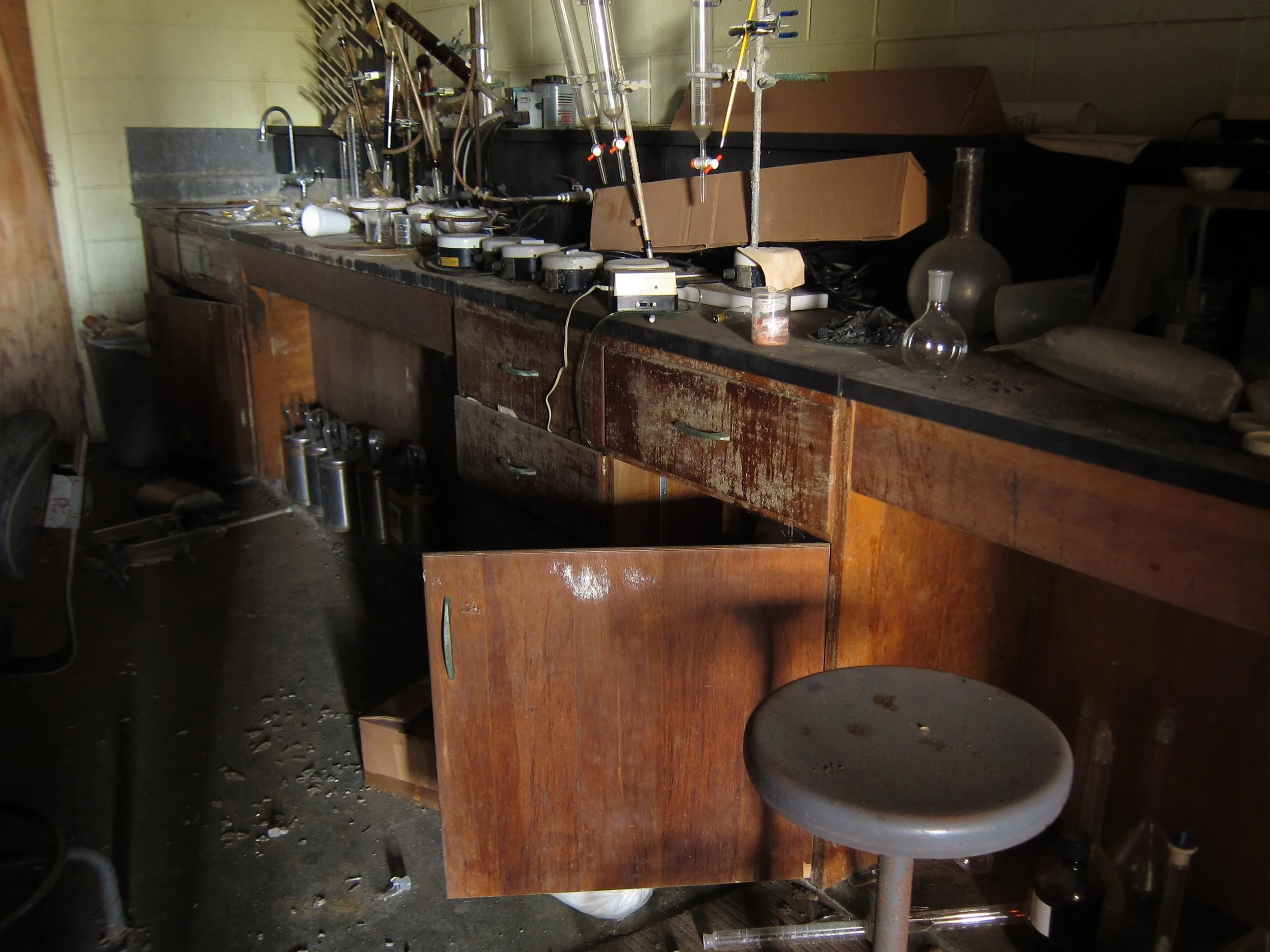 I had stumbled into the chemical engineering laboratory. The building itself suffered from some serious water damage - mold grew from the damp carpet and the air was thick with the earthy smell of mildew. Clumps of asbestos littered the floor from where fireproofing panels had dropping from the ceiling. Because of the bad air, I dug my respirator out of my bag and strapped it across my face. Two P95 particulate filters - one on each cheek - would provide me with a good protective barrier against any harmful airborne particles. Still, I stepped carefully, trying not to kick up any more dust than I had to.