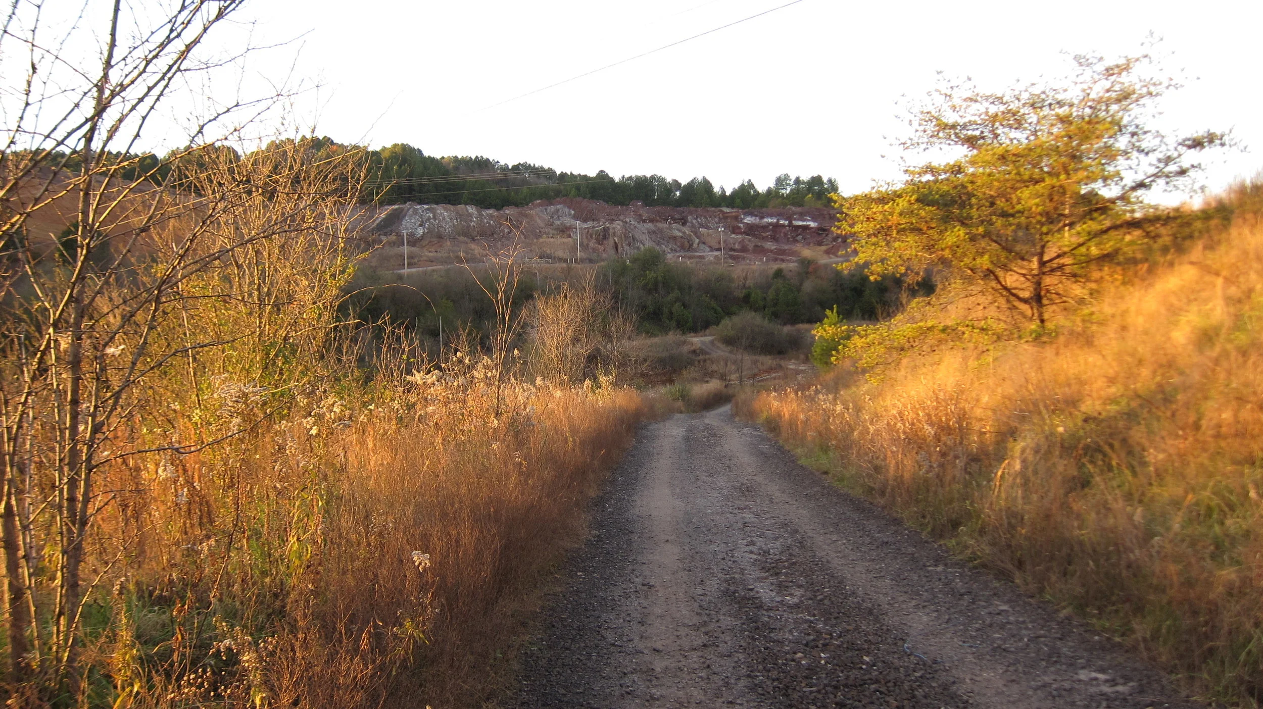 After stashing my truck off-site where it wouldn't be discovered, I hoisted a bag full of gear over my shoulder and started the half-mile hike toward the plant complex. I approached the grounds from the north, where the kudzu fields weren't quite as thick. The tangle of vines quickly gave way to a young pine forest as I started making my way up a hill forming the northwestern boundary of the site. As I crested the hill, exposed cliffs of burnt sienna rose before me. An open pit mine maybe?