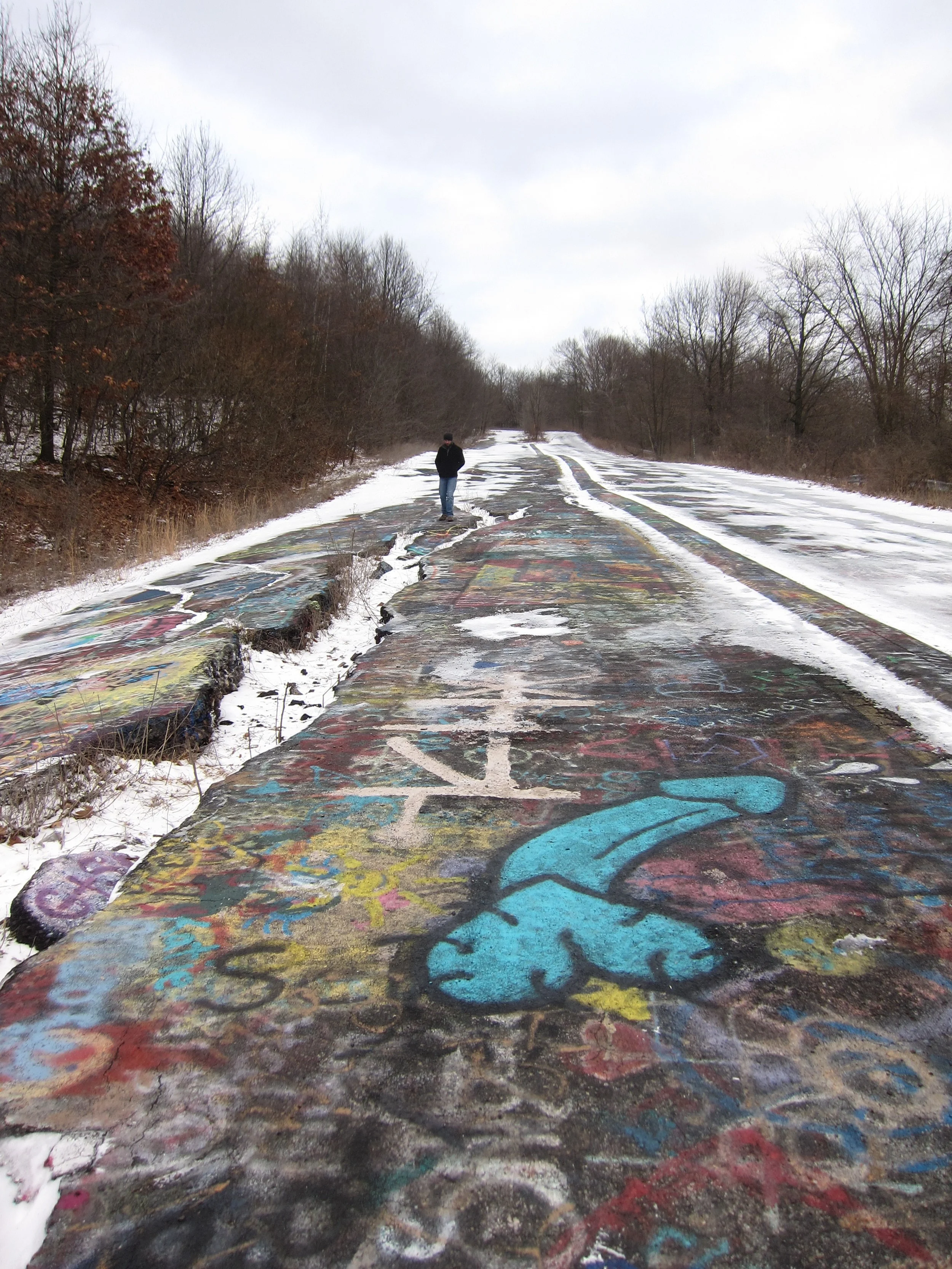Though a recent storm had blanketed much of the pavement in soft, powdery snow, large swaths remained uncovered due to the radiant warmth from the burning fires below. Extrapolating from what I could see on the exposed patches of asphalt, there must have been upwards of 1,000 dicks of every size, shape and color stretching all the way to the horizon, for just shy of a mile (for the full effect, do a quick Google image search for "Centralia graffiti dicks" and prepare to be amazed at the sheer tenacity of rural teenagers with nothing better to do with their time).