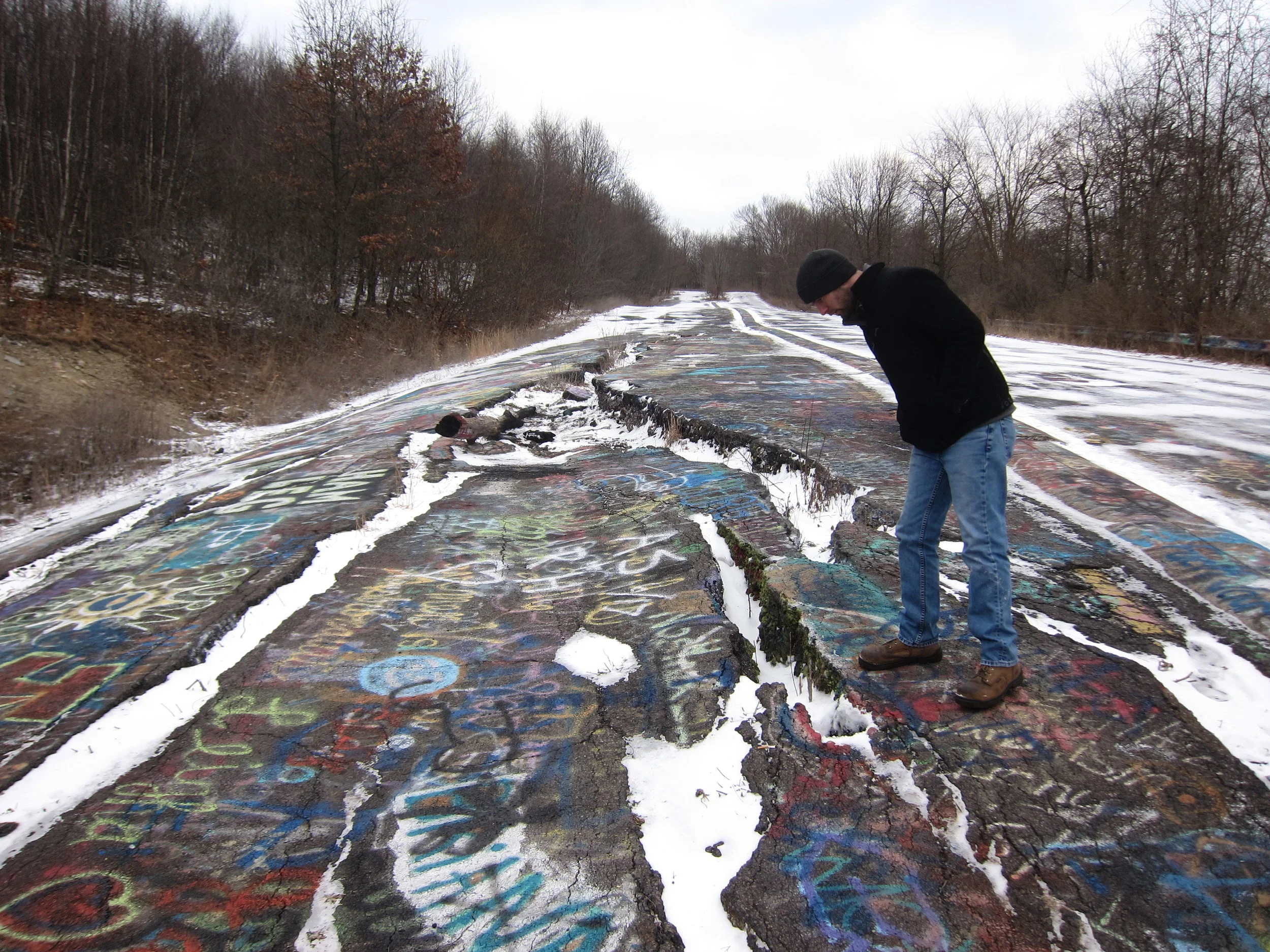 We pulled off the highway and parked next to the larger of Centralia's two cemeteries, the final resting place of the parishioners and family of the Saints Peter and Paul Russian Orthodox Church. A scattering of empty aerosol paint cans and glistening, ice-filled footprints guided us along a worn dirt path that crisscrossed around gnarled oak trees and chunks of broken asphalt. The ground here is pockmarked with dips and depressions, like the remnant craters in a recovering war zone; as the underground coal seam burned away, the earth above it settled unevenly into these newly created subterranean voids. Nowhere is this bizarre morphology more apparent than on the surface of what's come to be known as Graffiti Highway, the three-quarters of a mile long stretch of Route 61 around which we'd detoured on our way into town.